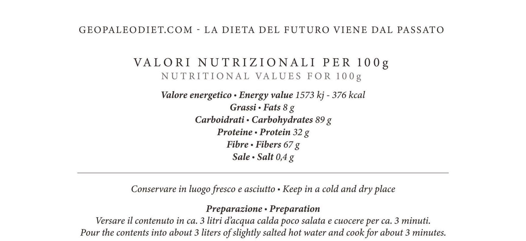 N U T R I T I O N A L VA L U S S F O R 1 O O G; Valor energético • Valor energético 1573 kj - 376 kcal • Grasas 8 g • Carbohidratos 89 g • Proteínas 32 g • Fibras 67 g • Sal 0.4 g Almacene en un lugar fresco y seco. • Mantenga en un lugar frío y seco • Preparación: verter el contenido en aprox. 3 litros de agua caliente, ligeramente salada y cocinar durante aprox. 3 minutos. Verter en unos 3 minutos. Pack de 250 gramos https://egress.storeden.net/gallery/619231babe7ea01ff328de9d5.975.9700outofstockpastapaleopastazerocerealipastasenzaglutinepastaplatanoplatanoZero Cereali32https://cdn.storeden.net/secache/619231babe7ea01ff328de9d264815181710370326481518169666281696664416966646zerocereali_platano_250g
