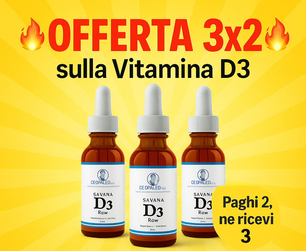 🔥 Approfitta della promo 3x2 su Vitamina D3 Savana Raw GeoPaleoDiet liquida in olio extravergine di oliva biologico italiano (240.000 UI per flacone!):